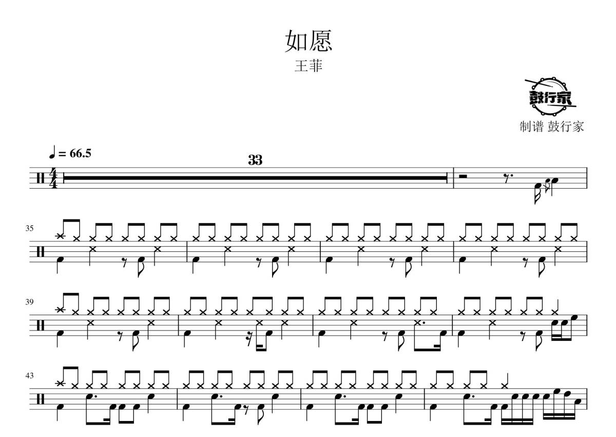 《如愿》是王菲演唱的一首歌曲,拍号为4/4拍,歌曲速度为每分钟66拍,这份鼓谱共有一张高清图谱,图谱由 @鼓行家 编配上传,图谱使用五线谱编配,使用这份如愿架子鼓谱,你将能够轻松地敲打出这首王菲的如愿,快来尝试吧。