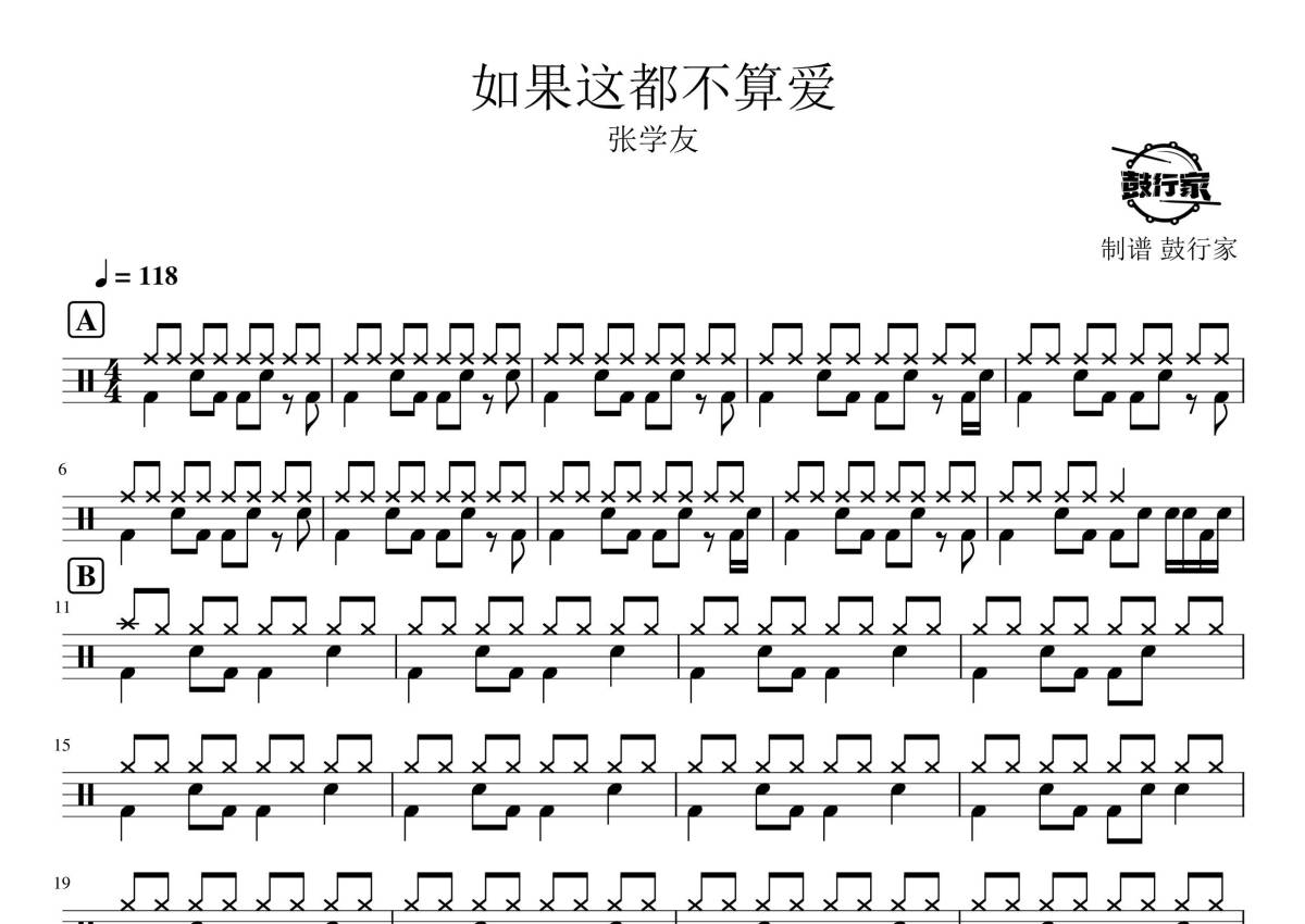《如果这都不算爱》是张学友演唱的一首歌曲,拍号为4/4拍,歌曲速度为每分钟118拍,这份鼓谱共有两张高清图谱,图谱由 @鼓行家 编配上传,图谱使用五线谱编配,使用这份如果这都不算爱架子鼓谱,你将能够轻松地敲打出这首张学友的如果这都不算爱,快来尝试吧。