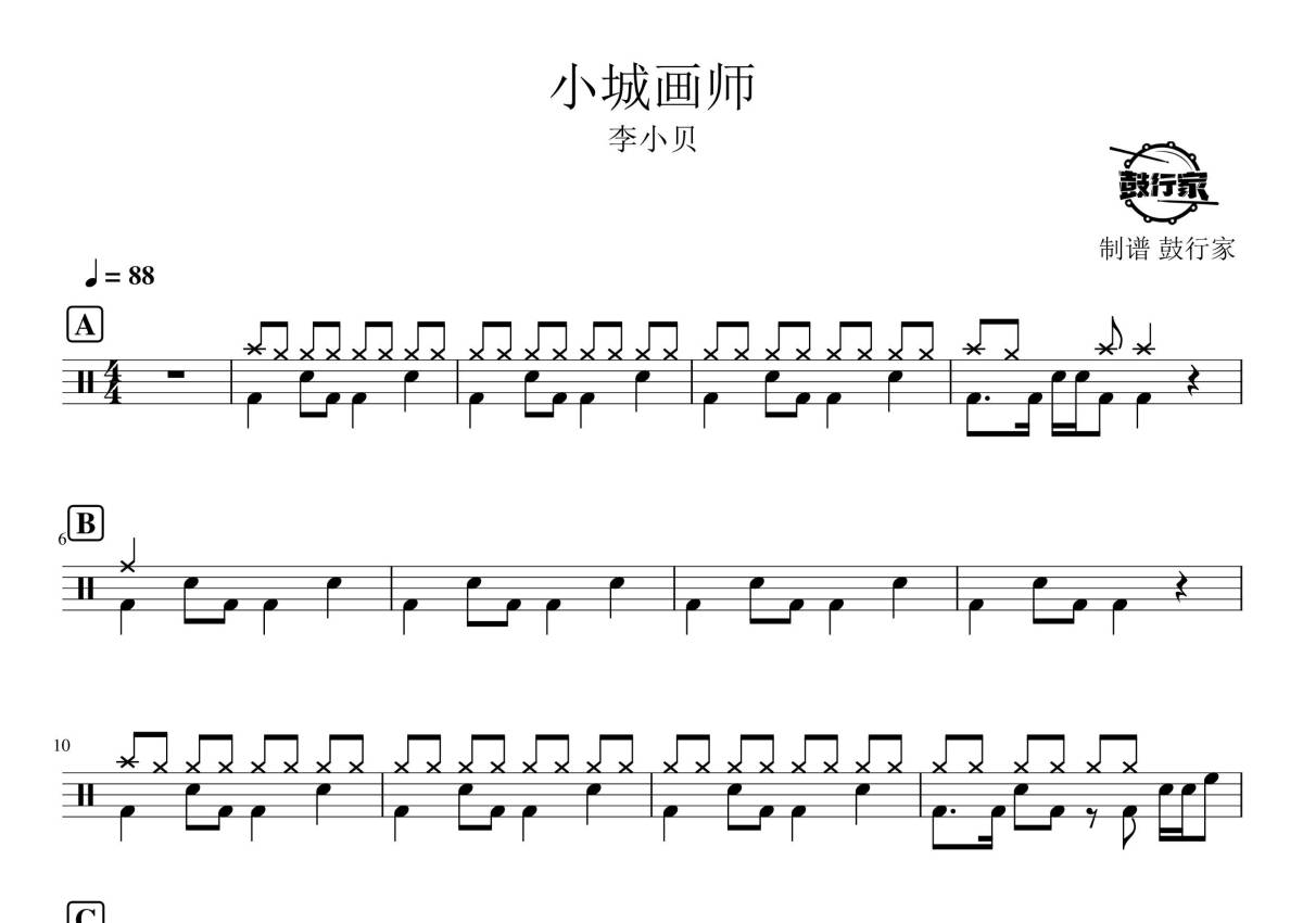 《小城画师》是李小贝演唱的一首歌曲,拍号为4/4拍,歌曲速度为每分钟88拍,这份鼓谱共有两张高清图谱,图谱由 @鼓行家 编配上传,图谱使用五线谱编配,使用这份小城画师架子鼓谱,你将能够轻松地敲打出这首李小贝的小城画师,快来尝试吧。