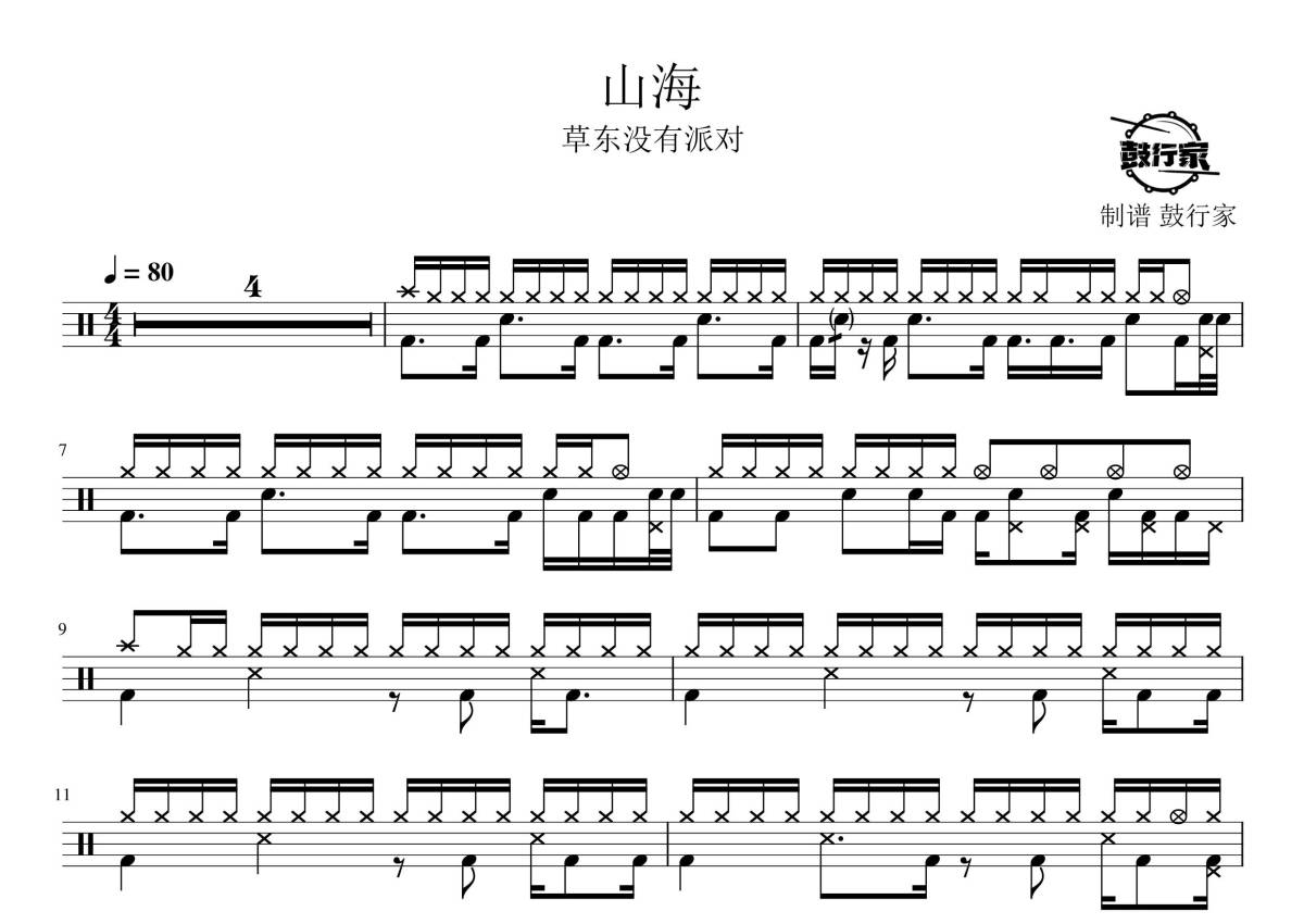《山海》是草东没有派对演唱的一首歌曲,拍号为4/4拍,歌曲速度为每分钟80拍,这份鼓谱共有四张高清图谱,图谱由 @鼓行家 编配上传,图谱使用五线谱编配,使用这份山海架子鼓谱,你将能够轻松地敲打出这首草东没有派对的山海,快来尝试吧。