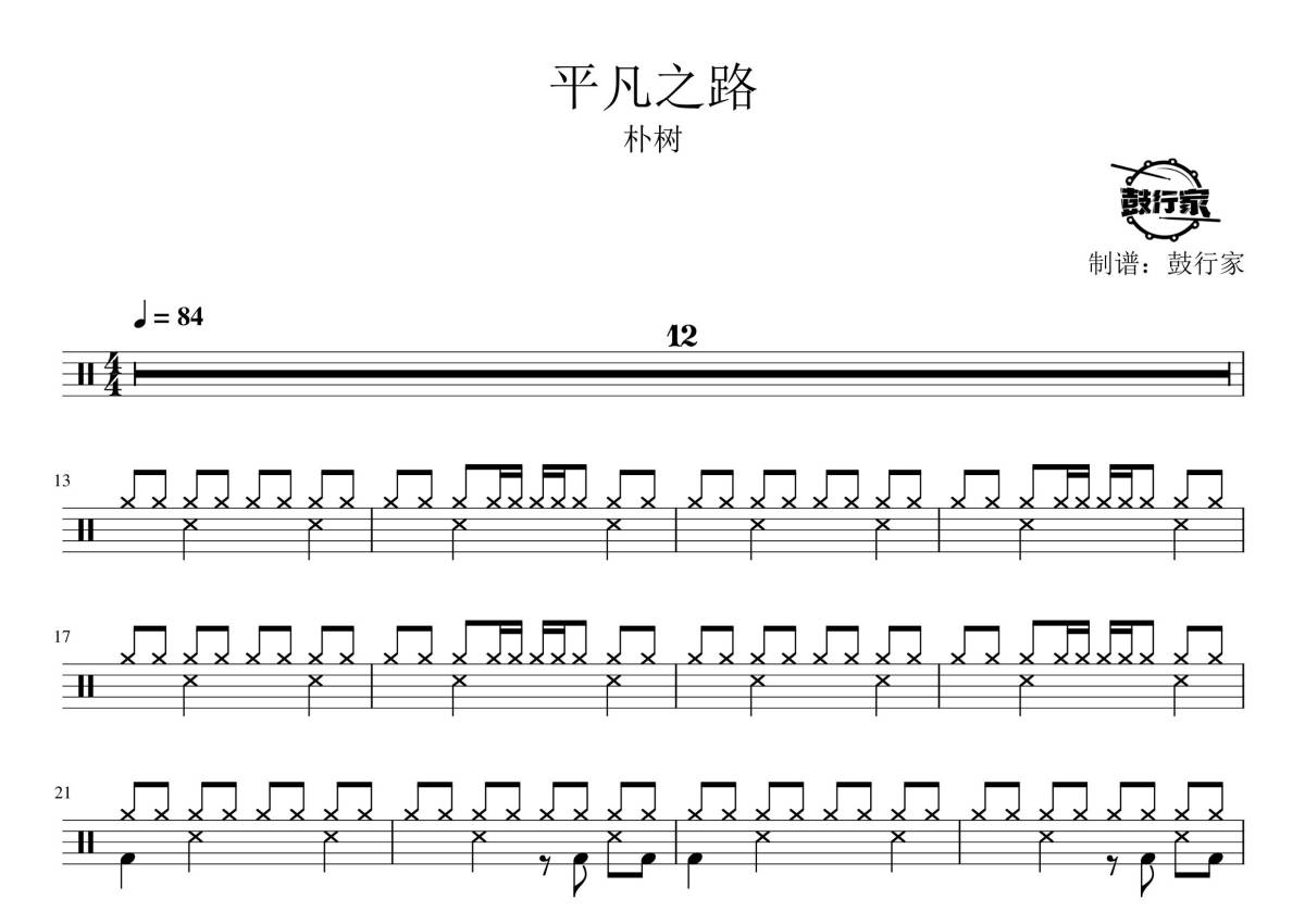 《平凡之路》是朴树演唱的一首歌曲,拍号为4/4拍,歌曲速度为每分钟84拍,这份鼓谱共有三张高清图谱,图谱由 @鼓行家 编配上传,图谱使用五线谱编配,使用这份平凡之路架子鼓谱,你将能够轻松地敲打出这首朴树的平凡之路,快来尝试吧。