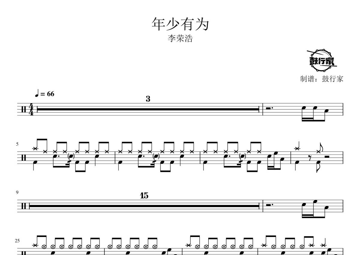 《年少有为》是李荣浩演唱的一首歌曲,拍号为4/4拍,歌曲速度为每分钟66拍,这份鼓谱共有两张高清图谱,图谱由 @鼓行家 编配上传,图谱使用五线谱编配,使用这份年少有为架子鼓谱,你将能够轻松地敲打出这首李荣浩的年少有为,快来尝试吧。