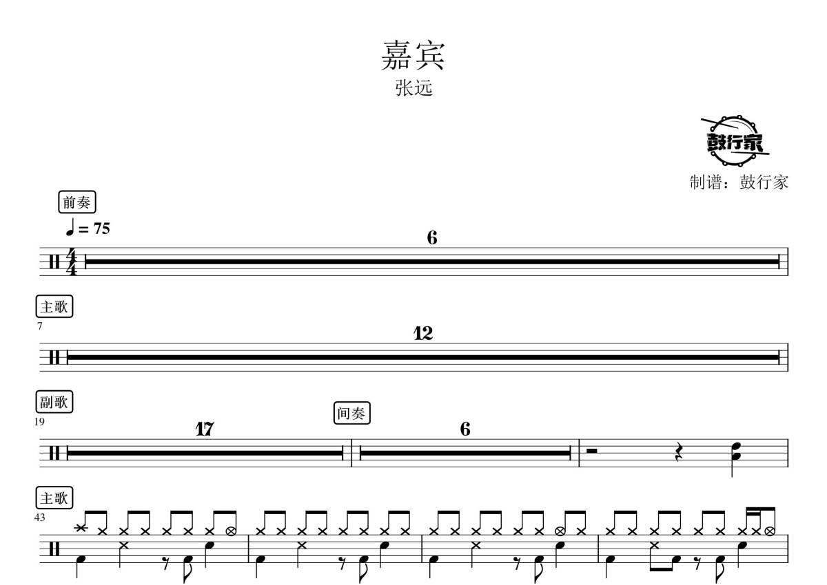 《嘉宾》是张远演唱的一首歌曲,拍号为4/4拍,歌曲速度为每分钟75拍,这份鼓谱共有两张高清图谱,图谱由 @鼓行家 编配上传,图谱使用五线谱编配,使用这份嘉宾架子鼓谱,你将能够轻松地敲打出这首张远的嘉宾,快来尝试吧。