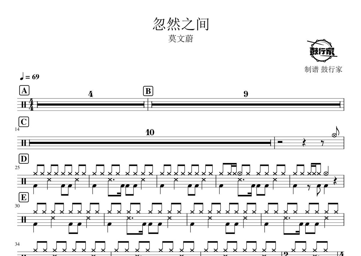 《忽然之间》是莫文蔚演唱的一首歌曲,拍号为4/4拍,歌曲速度为每分钟69拍,这份鼓谱共有一张高清图谱,图谱由 @鼓行家 编配上传,图谱使用五线谱编配,使用这份忽然之间架子鼓谱,你将能够轻松地敲打出这首莫文蔚的忽然之间,快来尝试吧。