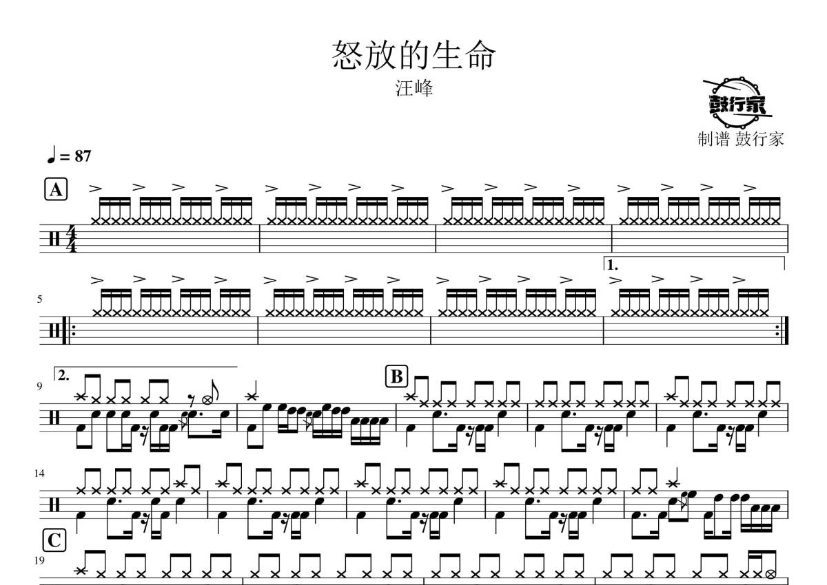 《怒放的生命》是汪峰演唱的一首歌曲,拍号为4/4拍,歌曲速度为每分钟87拍,这份鼓谱共有两张高清图谱,图谱由 @鼓行家 编配上传,图谱使用五线谱编配,使用这份怒放的生命架子鼓谱,你将能够轻松地敲打出这首汪峰的怒放的生命,快来尝试吧。