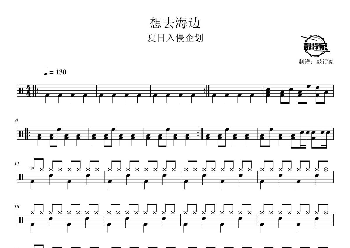 《想去海边》是夏日入侵企划演唱的一首歌曲,拍号为4/4拍,歌曲速度为每分钟130拍,这份鼓谱共有三张高清图谱,图谱由 @鼓行家 编配上传,图谱使用五线谱编配,使用这份想去海边架子鼓谱,你将能够轻松地敲打出这首夏日入侵企划的想去海边,快来尝试吧。