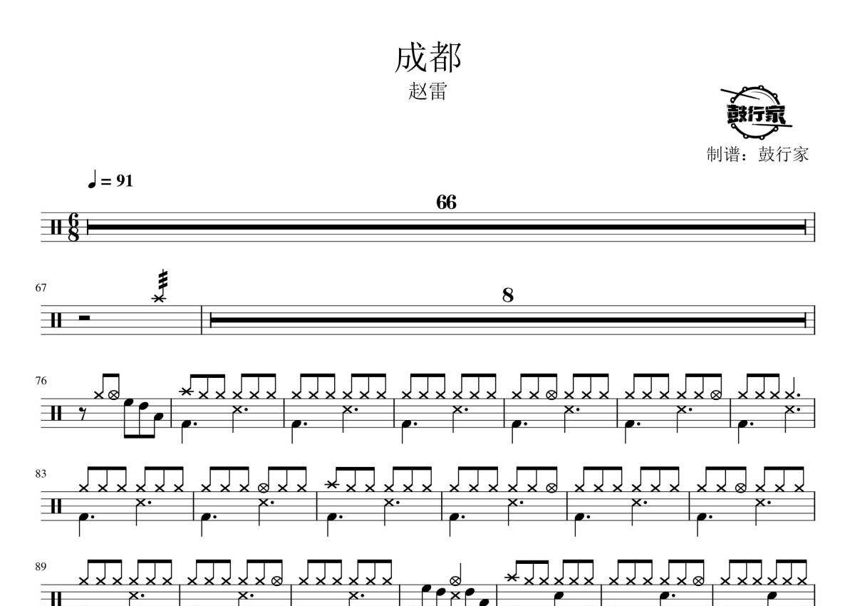 《成都》是赵雷演唱的一首歌曲,拍号为4/4拍,歌曲速度为每分钟91拍,这份鼓谱共有一张高清图谱,图谱由 @鼓行家 编配上传,图谱使用五线谱编配,使用这份成都架子鼓谱,你将能够轻松地敲打出这首赵雷的成都,快来尝试吧。