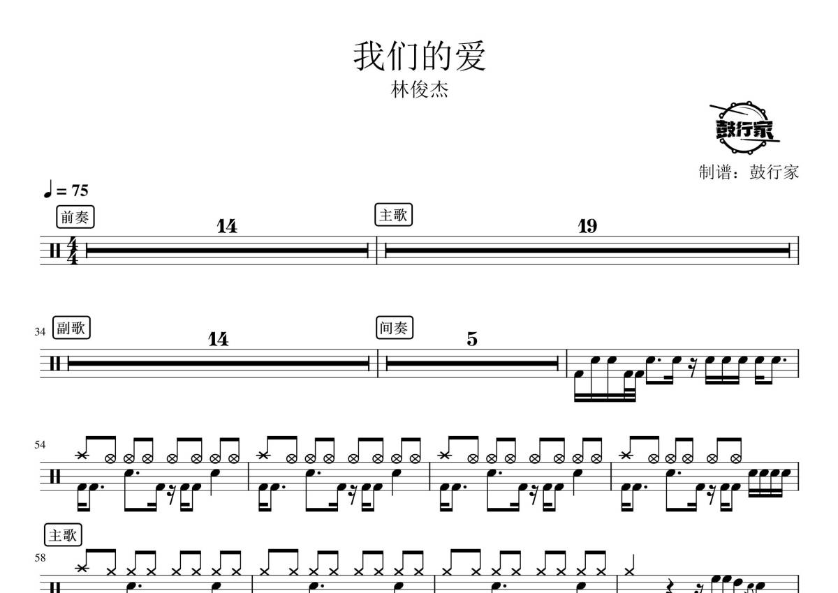 《我们的爱》是林俊杰演唱的一首歌曲,拍号为4/4拍,歌曲速度为每分钟75拍,这份鼓谱共有两张高清图谱,图谱由 @鼓行家 编配上传,图谱使用五线谱编配,使用这份我们的爱架子鼓谱,你将能够轻松地敲打出这首林俊杰的我们的爱,快来尝试吧。