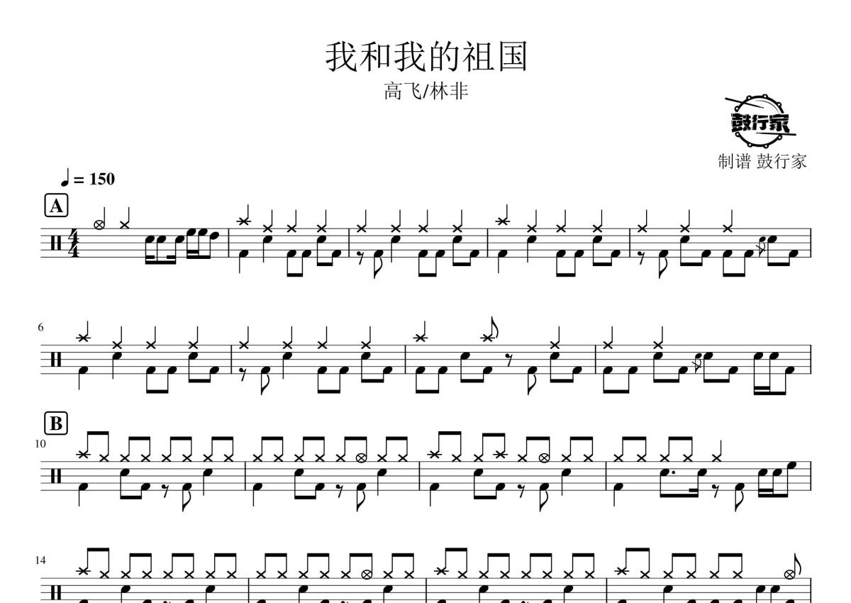 《我和我的祖国》是高飞/林非演唱的一首歌曲,拍号为4/4拍,歌曲速度为每分钟150拍,这份鼓谱共有两张高清图谱,图谱由 @鼓行家 编配上传,图谱使用五线谱编配,使用这份我和我的祖国架子鼓谱,你将能够轻松地敲打出这首高飞/林非的我和我的祖国,快来尝试吧。