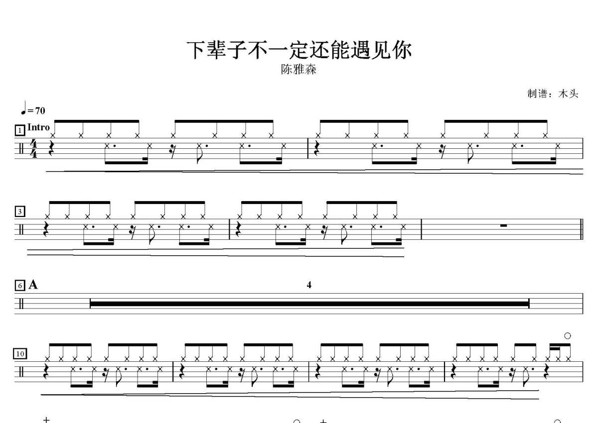 《下辈子不一定还能遇见你》是陈雅森演唱的一首歌曲,这份鼓谱共有两张高清图谱,图谱由 @打鼓谱 编配上传,图谱使用五线谱编配,使用这份下辈子不一定还能遇见你架子鼓谱,你将能够轻松地敲打出这首陈雅森的下辈子不一定还能遇见你,快来尝试吧。歌曲名:下辈子不一定还能遇见你,歌手名:陈雅森,专辑名:下辈子不一定还能遇见你。