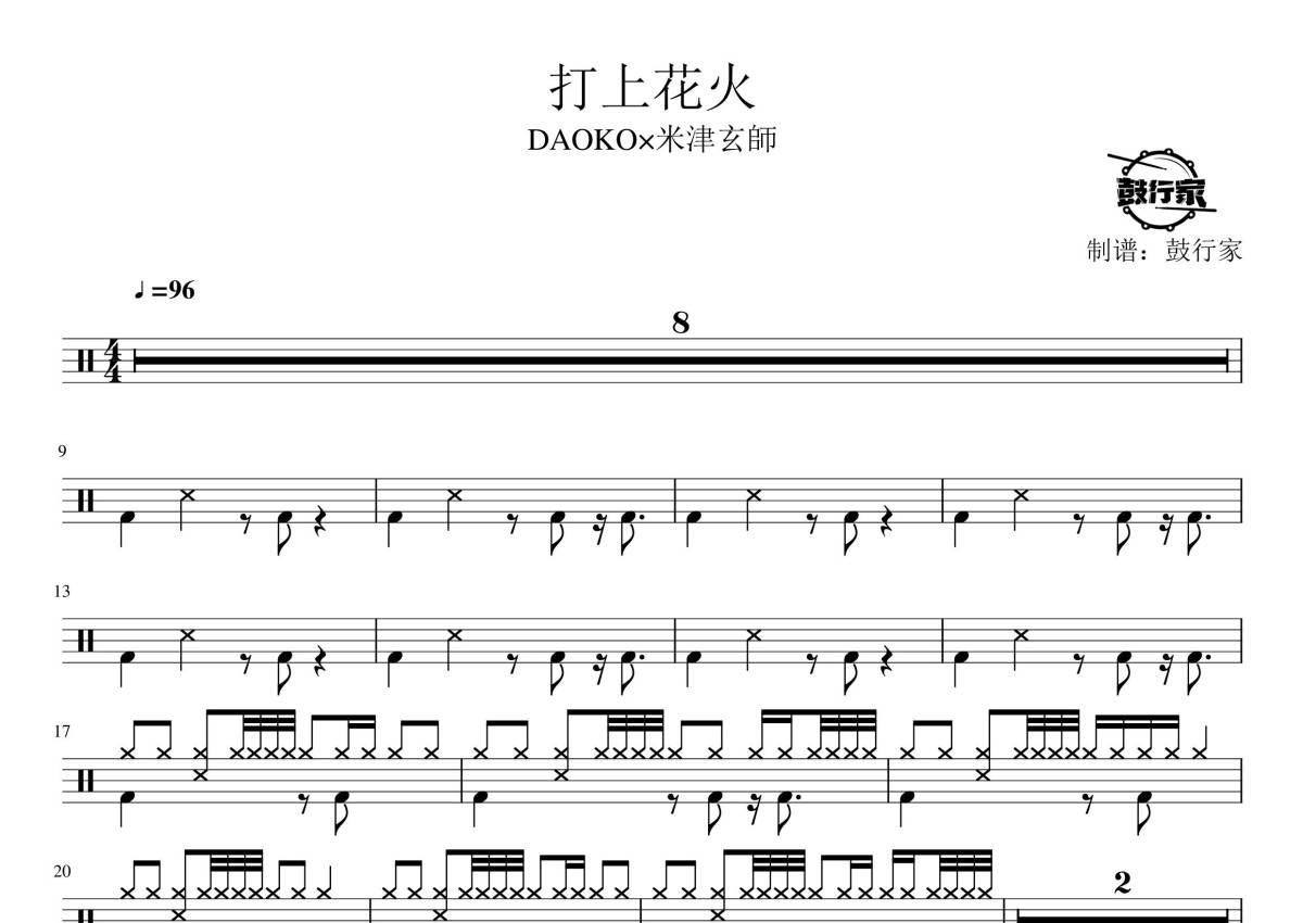 《打上花火》是米津玄师/DAOKO演唱的一首歌曲,拍号为4/4拍,歌曲速度为每分钟96拍,这份鼓谱共有两张高清图谱,图谱由 @鼓行家 编配上传,图谱使用五线谱编配,使用这份打上花火架子鼓谱,你将能够轻松地敲打出这首米津玄师/DAOKO的打上花火,快来尝试吧。