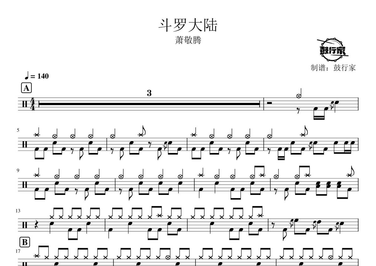 《斗罗大陆》是萧敬腾演唱的一首歌曲,拍号为4/4拍,歌曲速度为每分钟140拍,这份鼓谱共有三张高清图谱,图谱由 @鼓行家 编配上传,图谱使用五线谱编配,使用这份斗罗大陆架子鼓谱,你将能够轻松地敲打出这首萧敬腾的斗罗大陆,快来尝试吧。