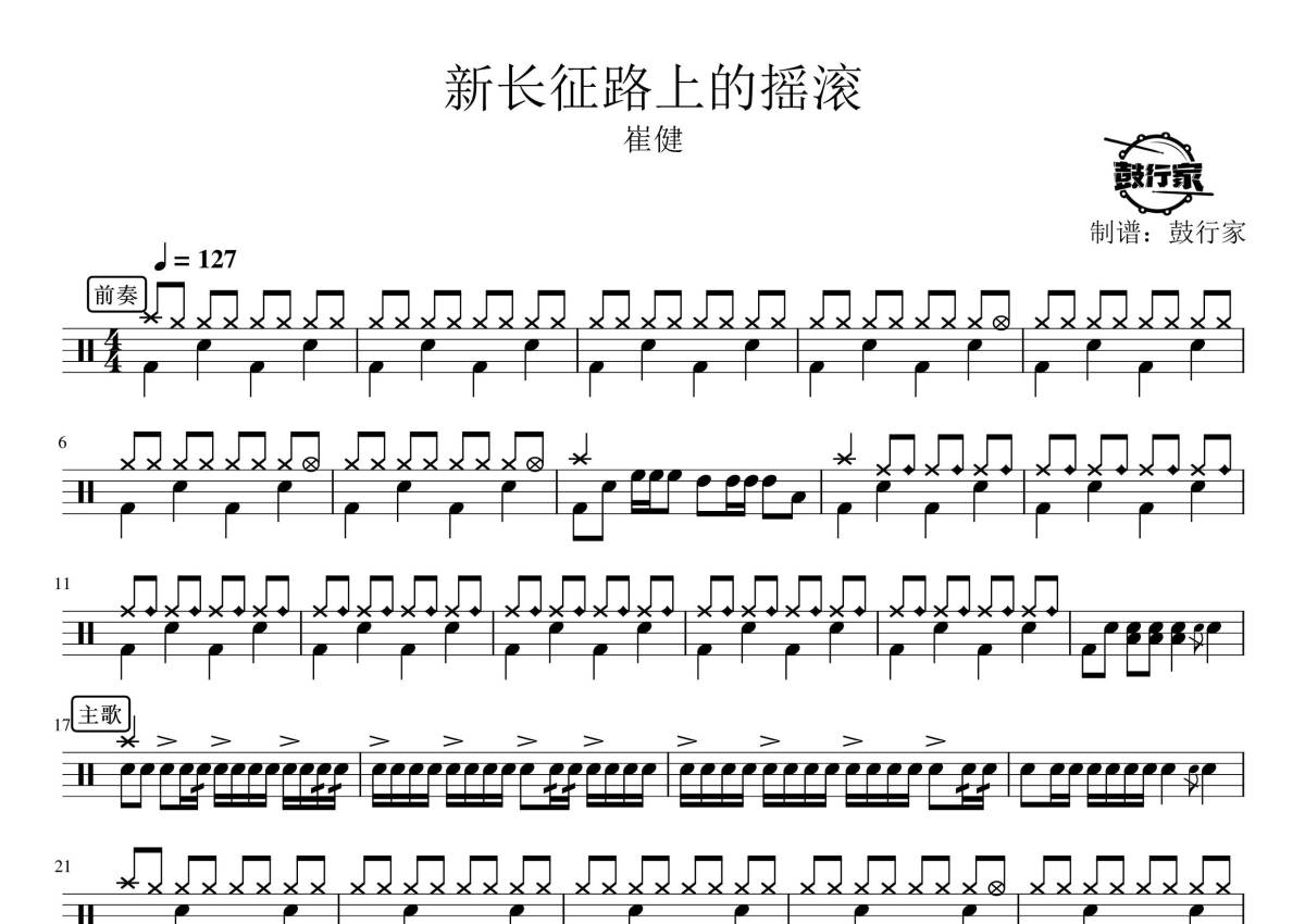 《新长征路上的摇滚》是崔健演唱的一首歌曲,拍号为4/4拍,歌曲速度为每分钟127拍,这份鼓谱共有三张高清图谱,图谱由 @鼓行家 编配上传,图谱使用五线谱编配,使用这份新长征路上的摇滚架子鼓谱,你将能够轻松地敲打出这首崔健的新长征路上的摇滚,快来尝试吧。