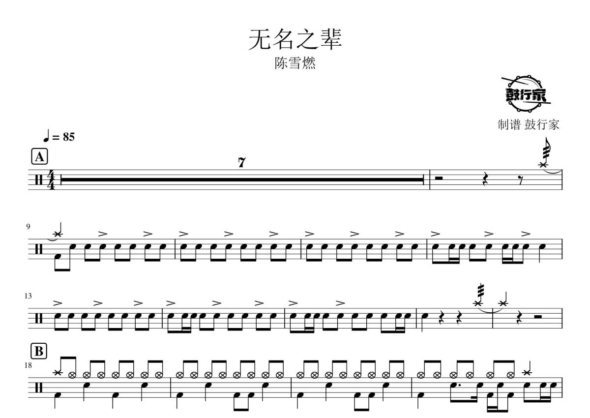 《无名之辈》是陈雪燃演唱的一首歌曲,拍号为4/4拍,歌曲速度为每分钟85拍,这份鼓谱共有两张高清图谱,图谱由 @鼓行家 编配上传,图谱使用五线谱编配,使用这份无名之辈架子鼓谱,你将能够轻松地敲打出这首陈雪燃的无名之辈,快来尝试吧。
