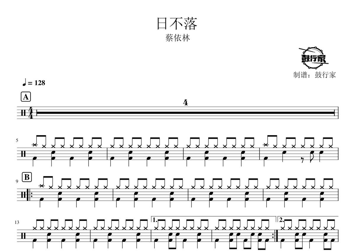 《日不落》是蔡依林演唱的一首歌曲,拍号为4/4拍,歌曲速度为每分钟128拍,这份鼓谱共有两张高清图谱,图谱由 @鼓行家 编配上传,图谱使用五线谱编配,使用这份日不落架子鼓谱,你将能够轻松地敲打出这首蔡依林的日不落,快来尝试吧。
