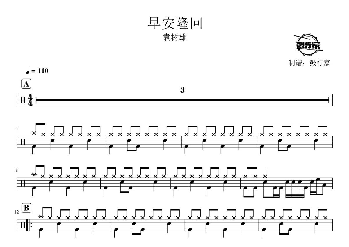 《早安隆回》是袁树维演唱的一首歌曲,拍号为4/4拍,歌曲速度为每分钟110拍,这份鼓谱共有两张高清图谱,图谱由 @鼓行家 编配上传,图谱使用五线谱编配,使用这份早安隆回架子鼓谱,你将能够轻松地敲打出这首袁树维的早安隆回,快来尝试吧。