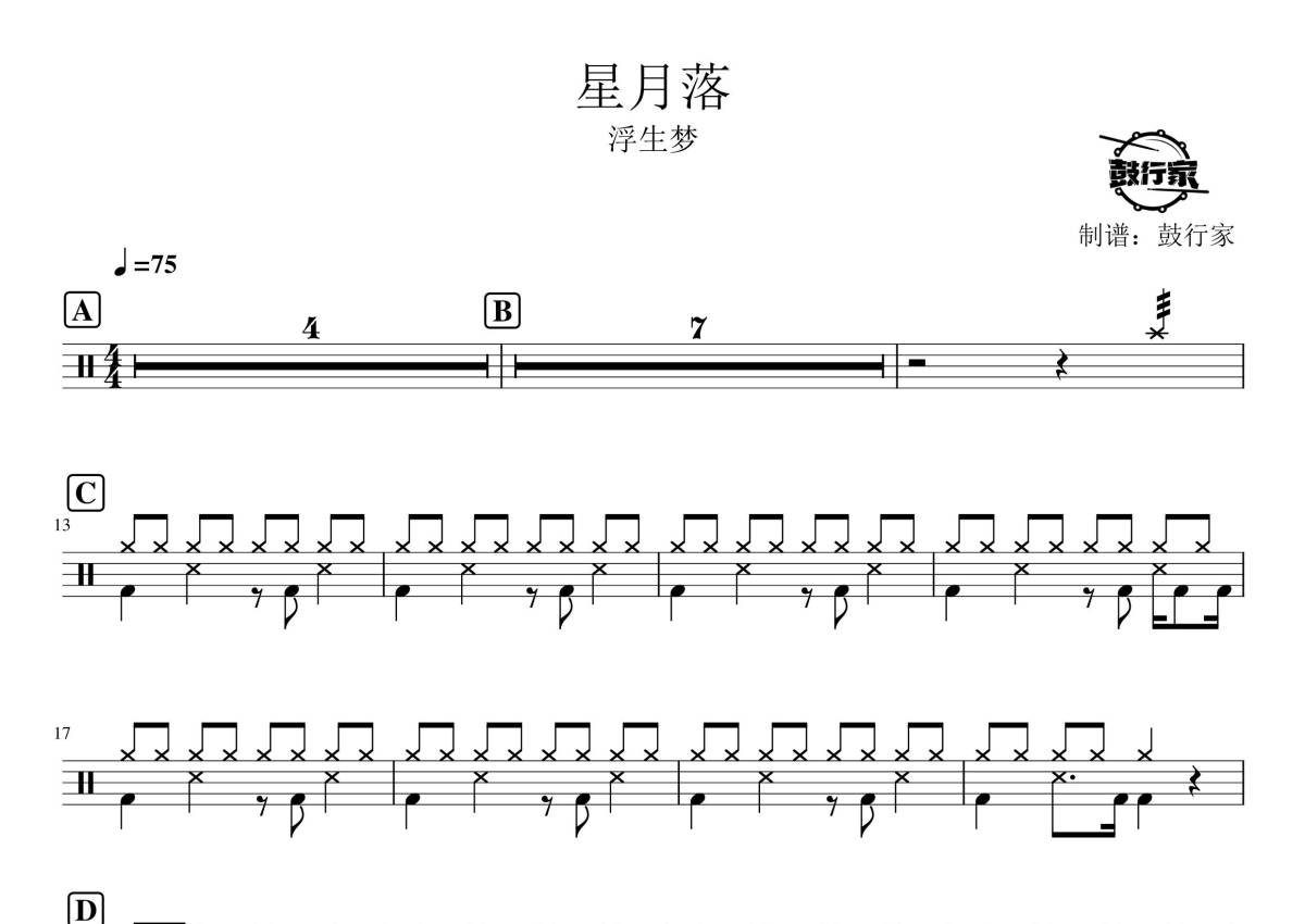 《星月落》是浮生梦演唱的一首歌曲,拍号为4/4拍,歌曲速度为每分钟75拍,这份鼓谱共有两张高清图谱,图谱由 @鼓行家 编配上传,图谱使用五线谱编配,使用这份星月落架子鼓谱,你将能够轻松地敲打出这首浮生梦的星月落,快来尝试吧。