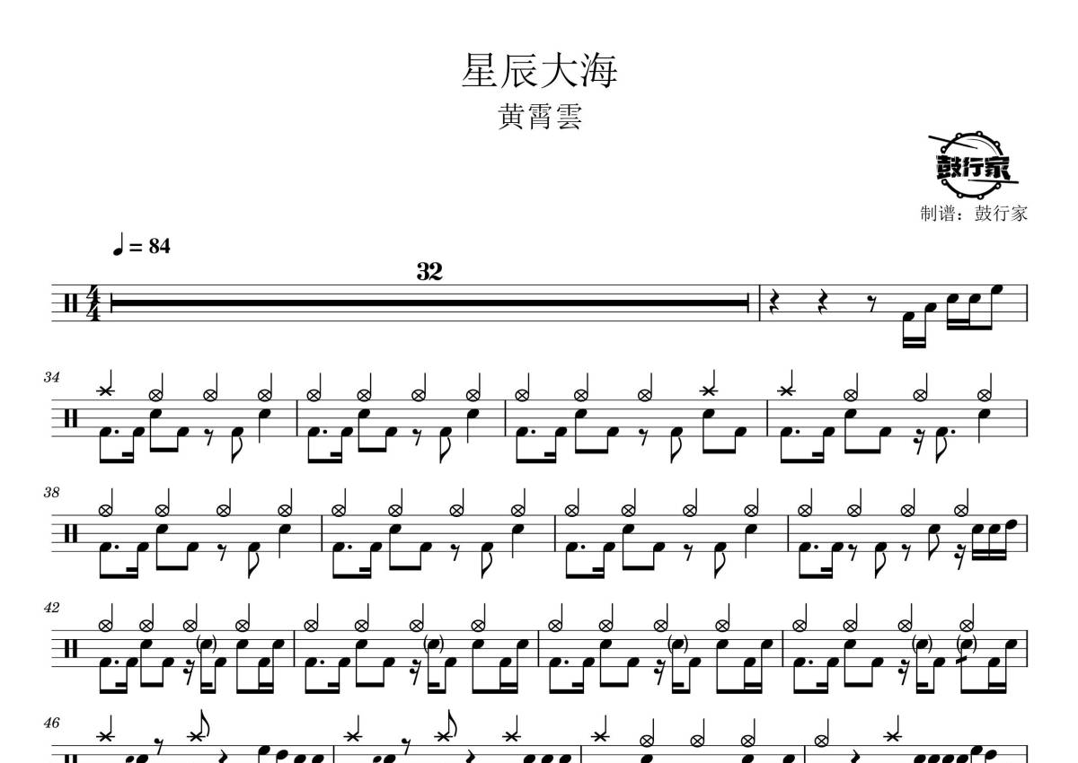 《星辰大海》是黄霄雲演唱的一首歌曲,拍号为4/4拍,歌曲速度为每分钟84拍,这份鼓谱共有一张高清图谱,图谱由 @鼓行家 编配上传,图谱使用五线谱编配,使用这份星辰大海架子鼓谱,你将能够轻松地敲打出这首黄霄雲的星辰大海,快来尝试吧。