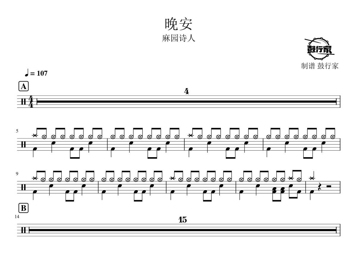 麻园诗人《晚安》鼓谱 - 架子鼓谱