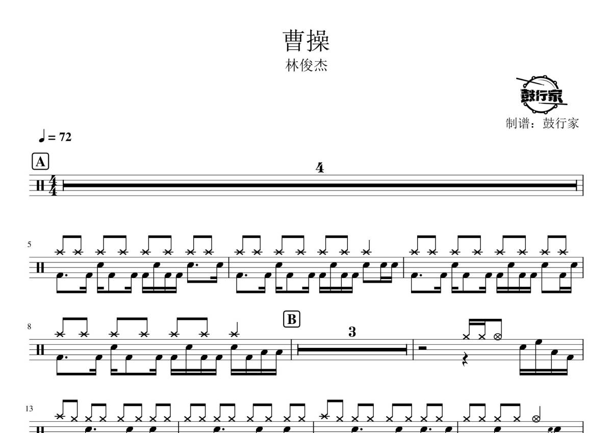 《曹操》是林俊杰演唱的一首歌曲,拍号为4/4拍,歌曲速度为每分钟72拍,这份鼓谱共有两张高清图谱,图谱由 @鼓行家 编配上传,图谱使用五线谱编配,使用这份曹操架子鼓谱,你将能够轻松地敲打出这首林俊杰的曹操,快来尝试吧。