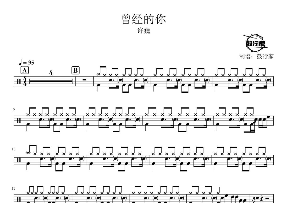《曾经的你》是许巍演唱的一首歌曲,拍号为4/4拍,歌曲速度为每分钟95拍,这份鼓谱共有三张高清图谱,图谱由 @鼓行家 编配上传,图谱使用五线谱编配,使用这份曾经的你架子鼓谱,你将能够轻松地敲打出这首许巍的曾经的你,快来尝试吧。