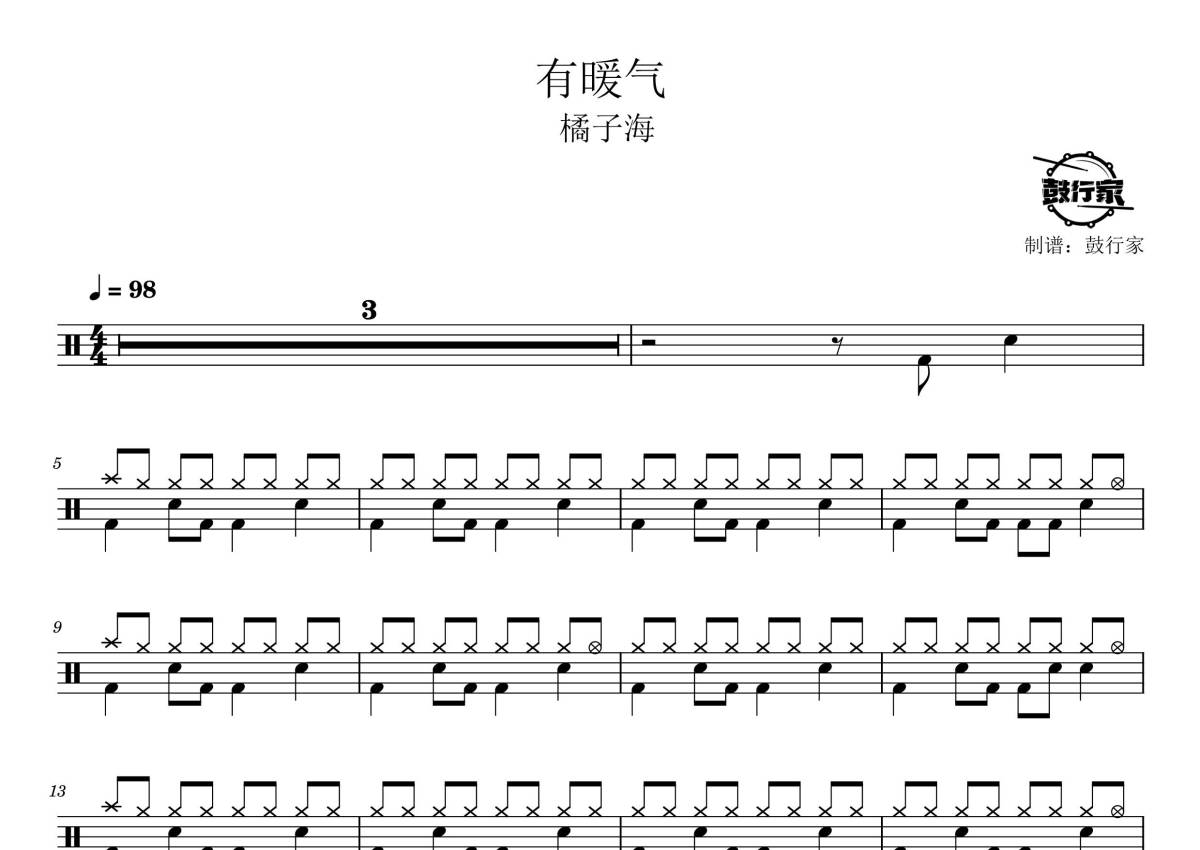 《有暖气》是橘子海演唱的一首歌曲,拍号为4/4拍,歌曲速度为每分钟98拍,这份鼓谱共有三张高清图谱,图谱由 @鼓行家 编配上传,图谱使用五线谱编配,使用这份有暖气架子鼓谱,你将能够轻松地敲打出这首橘子海的有暖气,快来尝试吧。