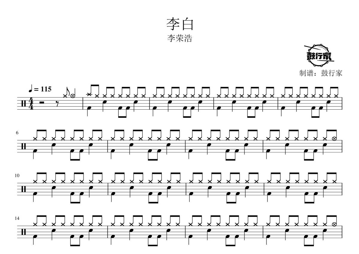 《李白》是李荣浩演唱的一首歌曲,拍号为4/4拍,歌曲速度为每分钟115拍,这份鼓谱共有三张高清图谱,图谱由 @鼓行家 编配上传,图谱使用五线谱编配,使用这份李白架子鼓谱,你将能够轻松地敲打出这首李荣浩的李白,快来尝试吧。