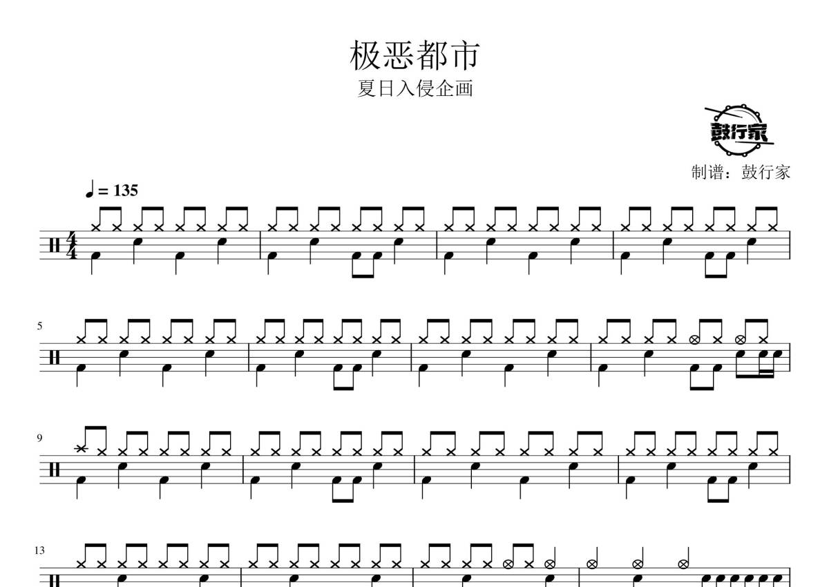 《极恶都市》是夏日入侵企画演唱的一首歌曲,拍号为4/4拍,歌曲速度为每分钟135拍,这份鼓谱共有四张高清图谱,图谱由 @鼓行家 编配上传,图谱使用五线谱编配,使用这份极恶都市架子鼓谱,你将能够轻松地敲打出这首夏日入侵企画的极恶都市,快来尝试吧。