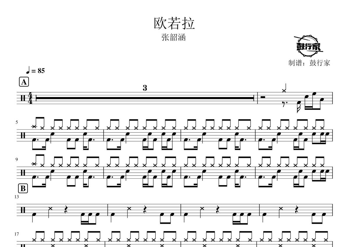 《欧若拉》是张韶涵演唱的一首歌曲,拍号为4/4拍,歌曲速度为每分钟85拍,这份鼓谱共有两张高清图谱,图谱由 @鼓行家 编配上传,图谱使用五线谱编配,使用这份欧若拉架子鼓谱,你将能够轻松地敲打出这首张韶涵的欧若拉,快来尝试吧。