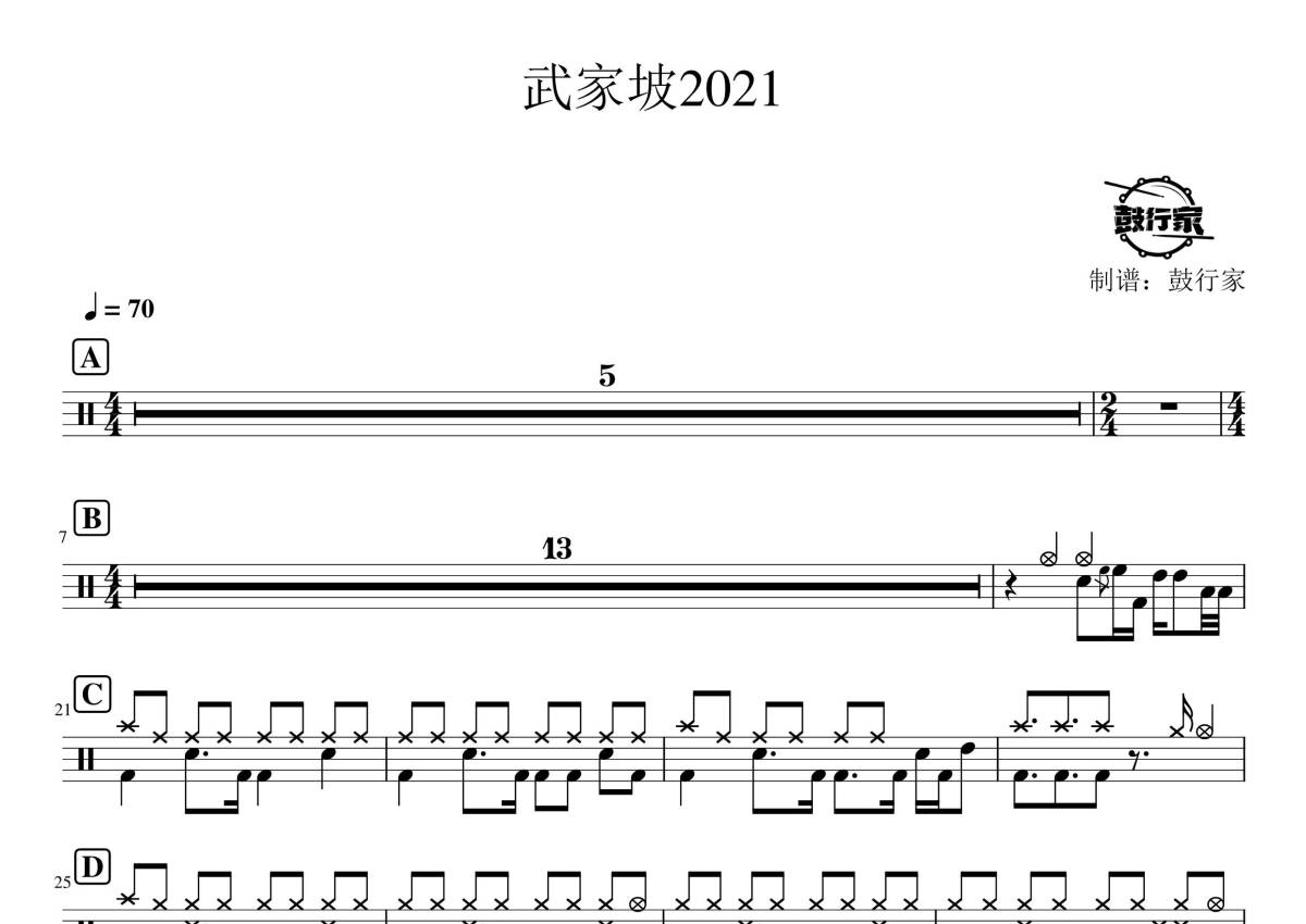 《武家坡2021》,拍号为4/4拍,歌曲速度为每分钟70拍,这份鼓谱共有两张高清图谱,图谱由 @鼓行家 编配上传,图谱使用五线谱编配,使用这份武家坡2021架子鼓谱,你将能够轻松地敲打出这首武家坡2021,快来尝试吧。