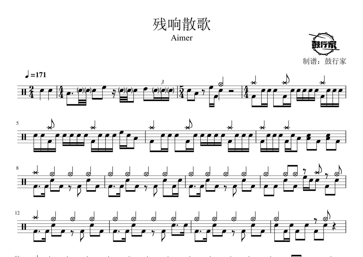 《残响散歌》是Aimer演唱的一首歌曲,拍号为4/4拍,歌曲速度为每分钟171拍,这份鼓谱共有三张高清图谱,图谱由 @鼓行家 编配上传,图谱使用五线谱编配,使用这份残响散歌架子鼓谱,你将能够轻松地敲打出这首Aimer的残响散歌,快来尝试吧。