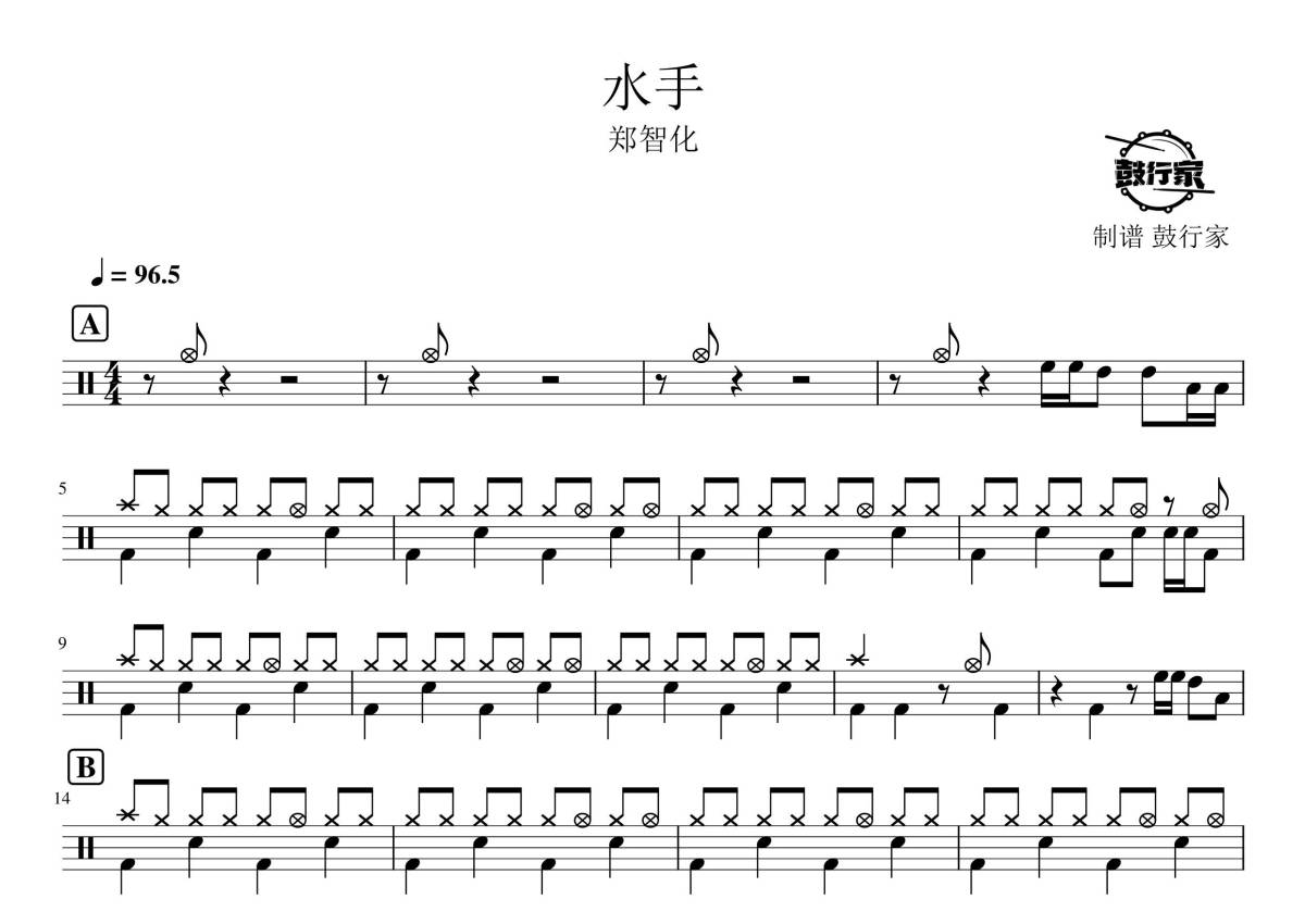 《水手》是郑智化演唱的一首歌曲,拍号为4/4拍,歌曲速度为每分钟96拍,这份鼓谱共有三张高清图谱,图谱由 @鼓行家 编配上传,图谱使用五线谱编配,使用这份水手架子鼓谱,你将能够轻松地敲打出这首郑智化的水手,快来尝试吧。