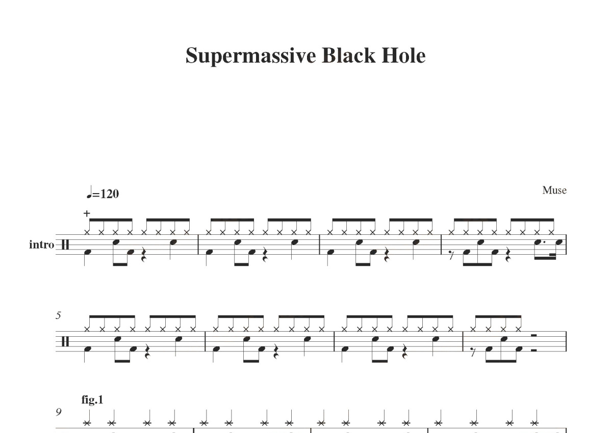 《Supermassive Black Hole》是Muse演唱的一首歌曲,这份鼓谱共有两张高清图谱,图谱由 @打鼓谱 编配上传,图谱使用五线谱编配,使用这份Supermassive Black Hole架子鼓谱,你将能够轻松地敲打出这首Muse的Supermassive Black Hole,快来尝试吧。首张收录专辑: Black Holes and Revelations