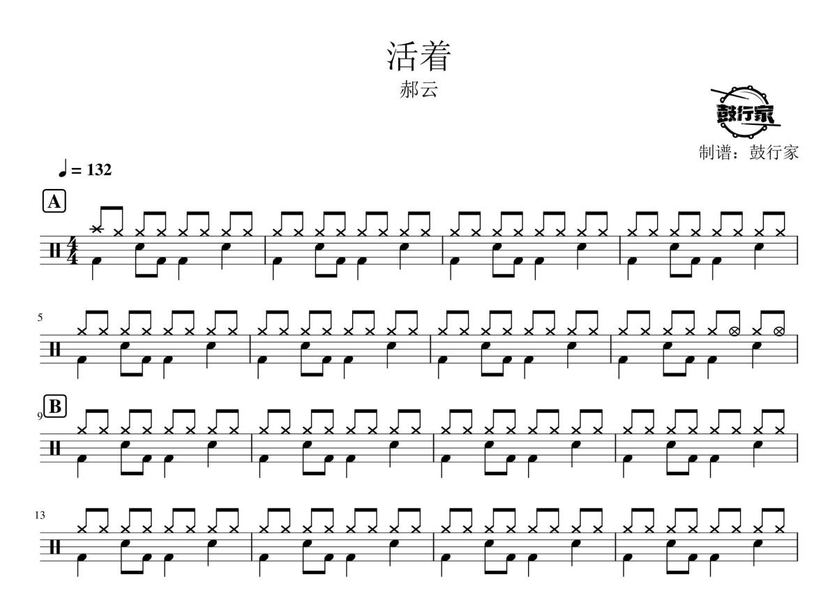 《活着》是郝云演唱的一首歌曲,拍号为4/4拍,歌曲速度为每分钟132拍,这份鼓谱共有三张高清图谱,图谱由 @鼓行家 编配上传,图谱使用五线谱编配,使用这份活着架子鼓谱,你将能够轻松地敲打出这首郝云的活着,快来尝试吧。