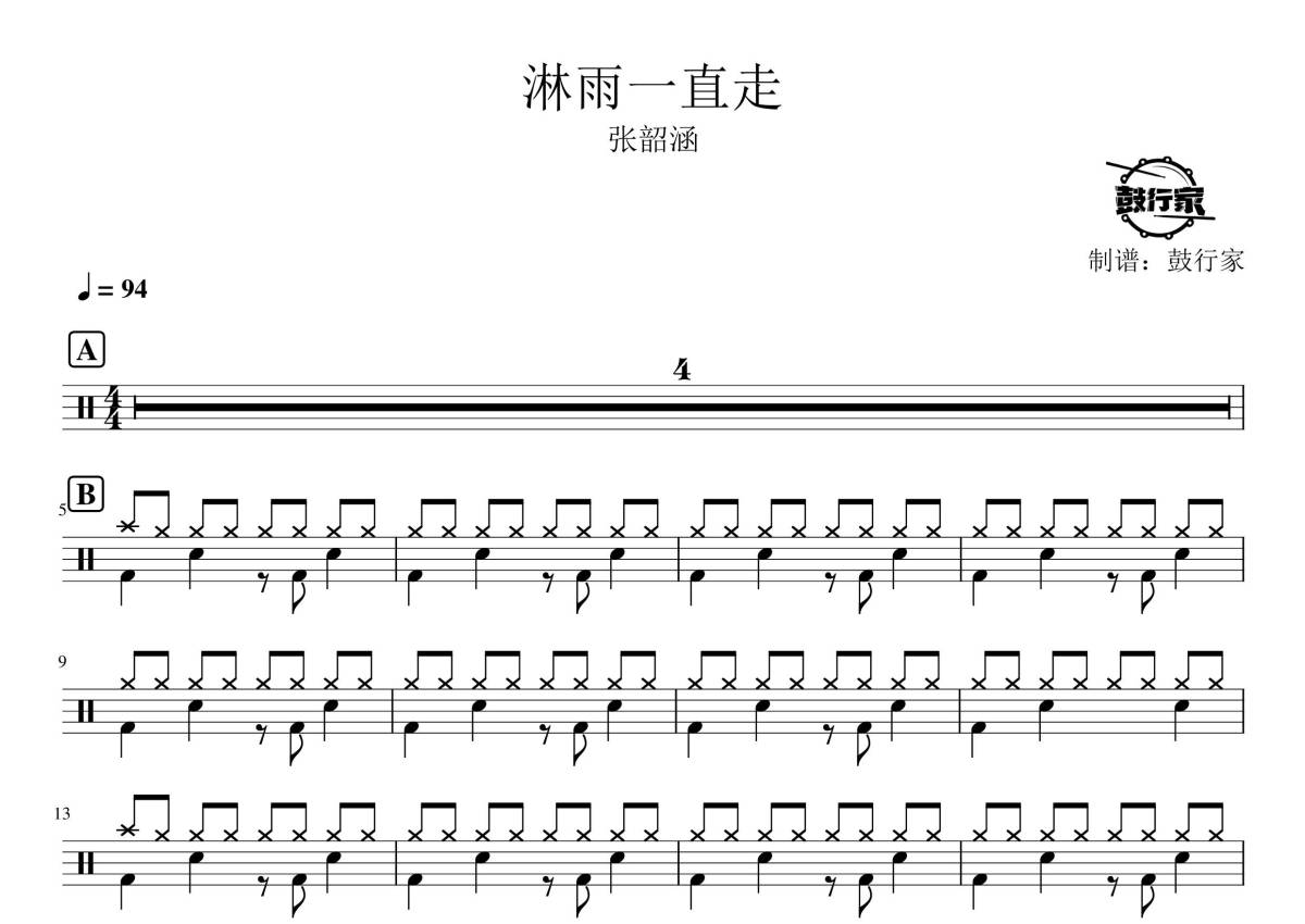《淋雨一直走》是张韶涵演唱的一首歌曲,拍号为4/4拍,歌曲速度为每分钟94拍,这份鼓谱共有两张高清图谱,图谱由 @鼓行家 编配上传,图谱使用五线谱编配,使用这份淋雨一直走架子鼓谱,你将能够轻松地敲打出这首张韶涵的淋雨一直走,快来尝试吧。