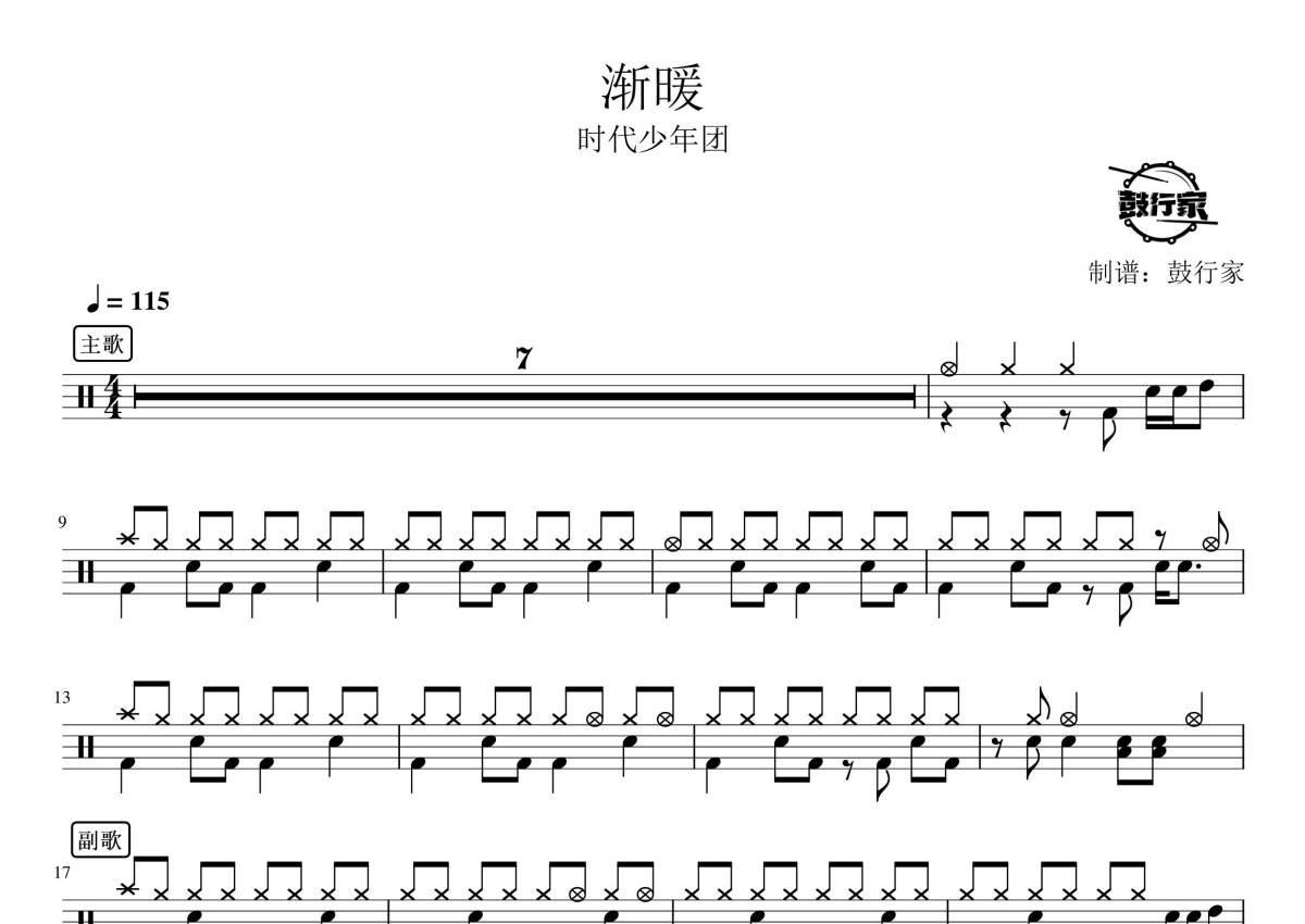 《渐暖》是时代少年团演唱的一首歌曲,拍号为4/4拍,歌曲速度为每分钟115拍,这份鼓谱共有两张高清图谱,图谱由 @鼓行家 编配上传,图谱使用五线谱编配,使用这份渐暖架子鼓谱,你将能够轻松地敲打出这首时代少年团的渐暖,快来尝试吧。