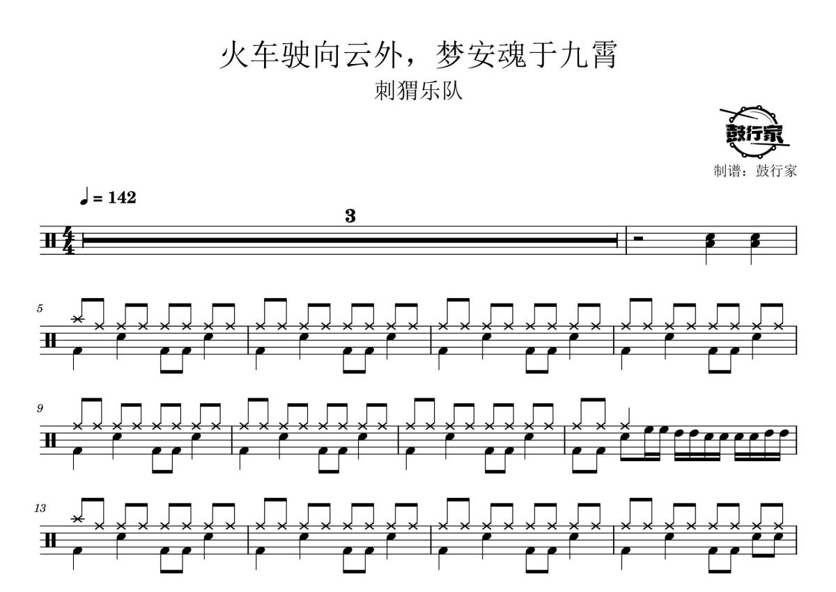 《火车驶向云外,梦安魂于九霄》是刺猬乐队演唱的一首歌曲,拍号为4/4拍,歌曲速度为每分钟142拍,这份鼓谱共有四张高清图谱,图谱由 @鼓行家 编配上传,图谱使用五线谱编配,使用这份火车驶向云外,梦安魂于九霄架子鼓谱,你将能够轻松地敲打出这首刺猬乐队的火车驶向云外,梦安魂于九霄,快来尝试吧。