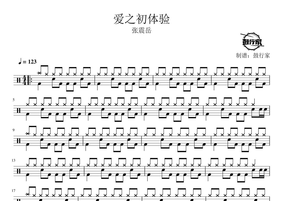 《爱之初体验》是张震岳演唱的一首歌曲,拍号为4/4拍,歌曲速度为每分钟123拍,这份鼓谱共有两张高清图谱,图谱由 @鼓行家 编配上传,图谱使用五线谱编配,使用这份爱之初体验架子鼓谱,你将能够轻松地敲打出这首张震岳的爱之初体验,快来尝试吧。