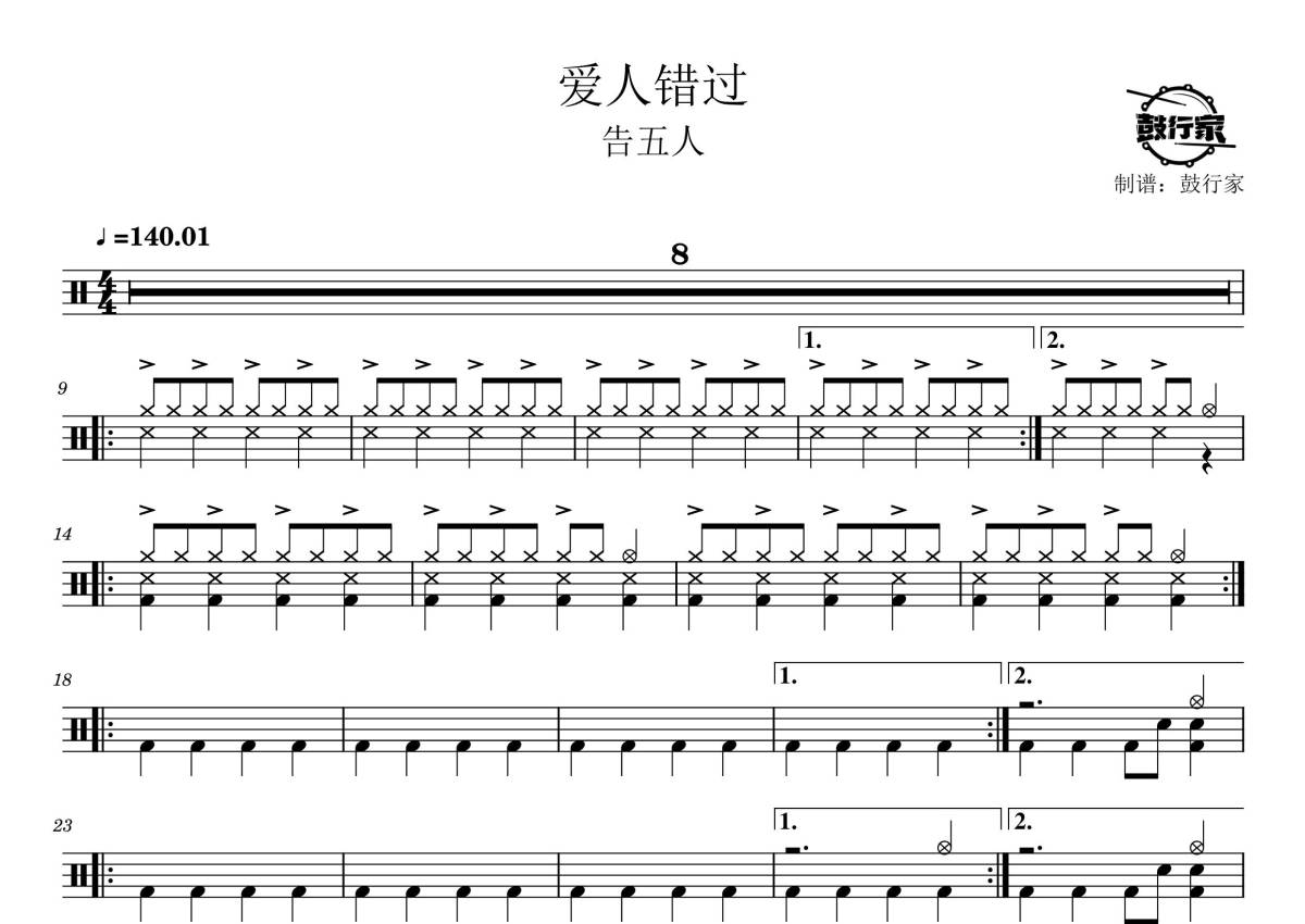 《爱人错过》是告五人演唱的一首歌曲,拍号为4/4拍,歌曲速度为每分钟140拍,这份鼓谱共有两张高清图谱,图谱由 @鼓行家 编配上传,图谱使用五线谱编配,使用这份爱人错过架子鼓谱,你将能够轻松地敲打出这首告五人的爱人错过,快来尝试吧。