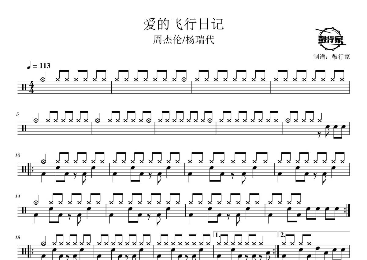 《爱的飞行日记》是周杰伦/杨瑞代演唱的一首歌曲,拍号为4/4拍,歌曲速度为每分钟113拍,这份鼓谱共有两张高清图谱,图谱由 @鼓行家 编配上传,图谱使用五线谱编配,使用这份爱的飞行日记架子鼓谱,你将能够轻松地敲打出这首周杰伦/杨瑞代的爱的飞行日记,快来尝试吧。