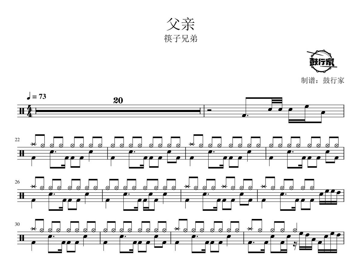 《父亲》是筷子兄弟演唱的一首歌曲,拍号为4/4拍,歌曲速度为每分钟73拍,这份鼓谱共有两张高清图谱,图谱由 @鼓行家 编配上传,图谱使用五线谱编配,使用这份父亲架子鼓谱,你将能够轻松地敲打出这首筷子兄弟的父亲,快来尝试吧。