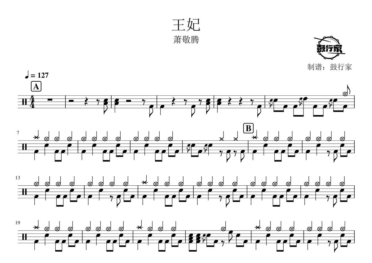 《王妃》是萧敬腾演唱的一首歌曲,拍号为4/4拍,歌曲速度为每分钟127拍,这份鼓谱共有两张高清图谱,图谱由 @鼓行家 编配上传,图谱使用五线谱编配,使用这份王妃架子鼓谱,你将能够轻松地敲打出这首萧敬腾的王妃,快来尝试吧。