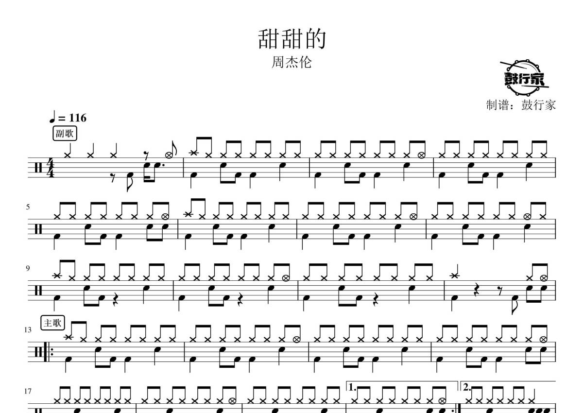 《甜甜的》是周杰伦演唱的一首歌曲,拍号为4/4拍,歌曲速度为每分钟116拍,这份鼓谱共有两张高清图谱,图谱由 @鼓行家 编配上传,图谱使用五线谱编配,使用这份甜甜的架子鼓谱,你将能够轻松地敲打出这首周杰伦的甜甜的,快来尝试吧。