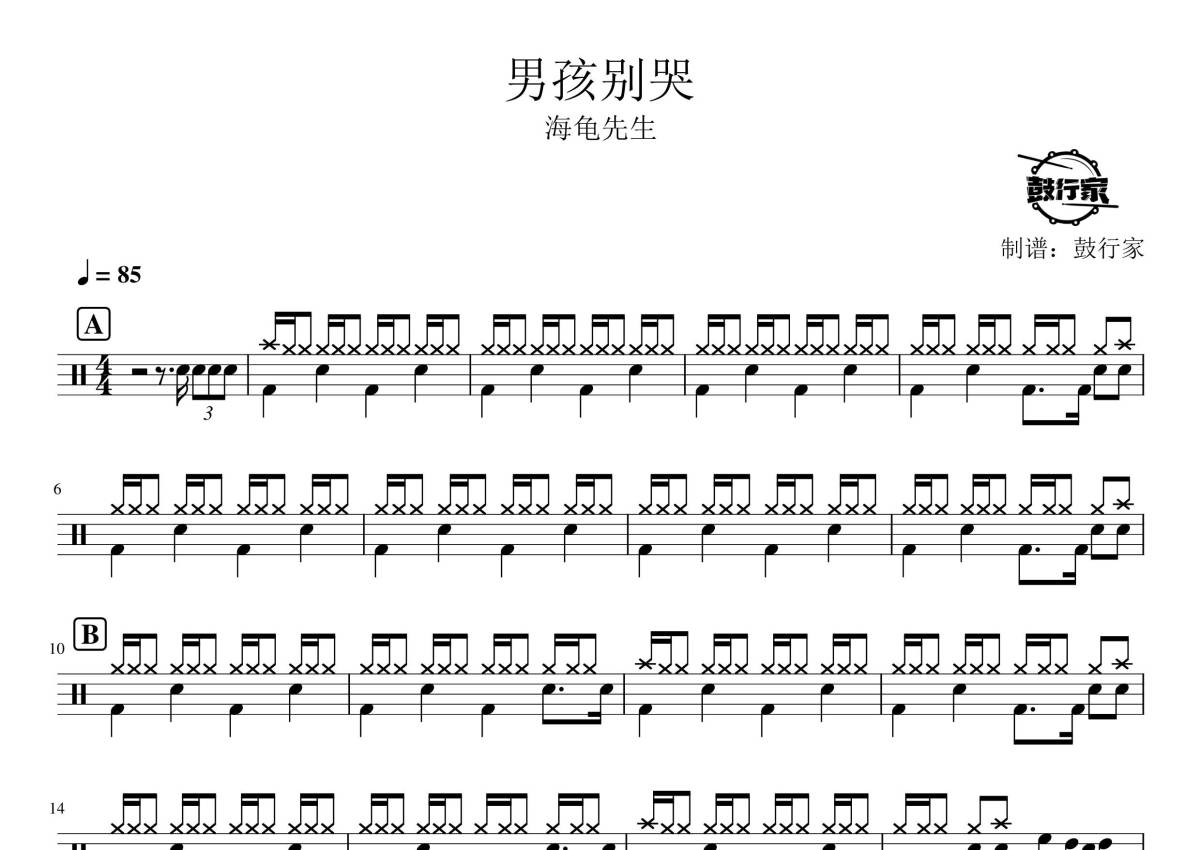 《男孩别哭》是海龟先生演唱的一首歌曲,拍号为4/4拍,歌曲速度为每分钟85拍,这份鼓谱共有三张高清图谱,图谱由 @鼓行家 编配上传,图谱使用五线谱编配,使用这份男孩别哭架子鼓谱,你将能够轻松地敲打出这首海龟先生的男孩别哭,快来尝试吧。