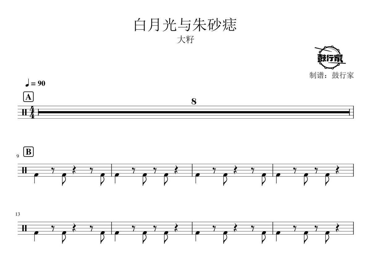 《白月光与朱砂痣》是大籽演唱的一首歌曲,拍号为4/4拍,歌曲速度为每分钟90拍,这份鼓谱共有两张高清图谱,图谱由 @鼓行家 编配上传,图谱使用五线谱编配,使用这份白月光与朱砂痣架子鼓谱,你将能够轻松地敲打出这首大籽的白月光与朱砂痣,快来尝试吧。