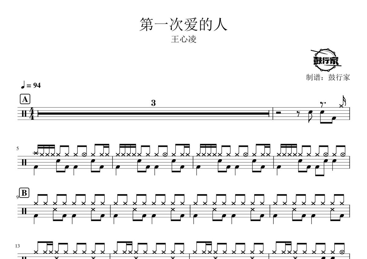 《第一次爱的人》是王心凌演唱的一首歌曲,拍号为4/4拍,歌曲速度为每分钟94拍,这份鼓谱共有三张高清图谱,图谱由 @鼓行家 编配上传,图谱使用五线谱编配,使用这份第一次爱的人架子鼓谱,你将能够轻松地敲打出这首王心凌的第一次爱的人,快来尝试吧。