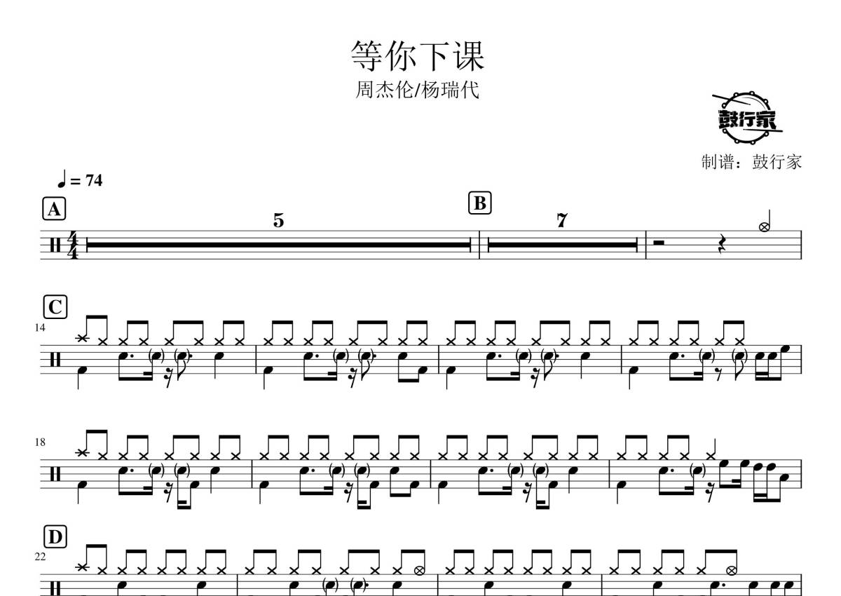《等你下课》是周杰伦演唱的一首歌曲,拍号为4/4拍,歌曲速度为每分钟74拍,这份鼓谱共有两张高清图谱,图谱由 @鼓行家 编配上传,图谱使用五线谱编配,使用这份等你下课架子鼓谱,你将能够轻松地敲打出这首周杰伦的等你下课,快来尝试吧。