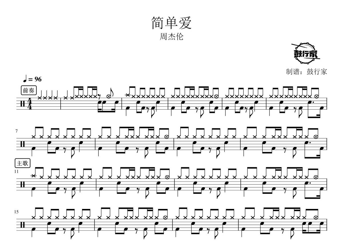《简单爱》是周杰伦演唱的一首歌曲,拍号为4/4拍,歌曲速度为每分钟96拍,这份鼓谱共有两张高清图谱,图谱由 @鼓行家 编配上传,图谱使用五线谱编配,使用这份简单爱架子鼓谱,你将能够轻松地敲打出这首周杰伦的简单爱,快来尝试吧。