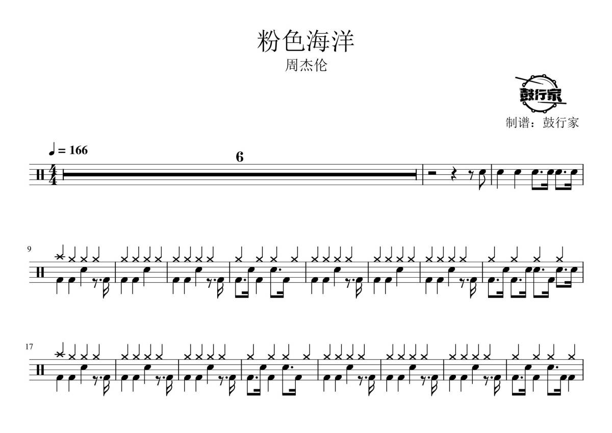 《粉色海洋》是周杰伦演唱的一首歌曲,拍号为4/4拍,歌曲速度为每分钟166拍,这份鼓谱共有两张高清图谱,图谱由 @鼓行家 编配上传,图谱使用五线谱编配,使用这份粉色海洋架子鼓谱,你将能够轻松地敲打出这首周杰伦的粉色海洋,快来尝试吧。