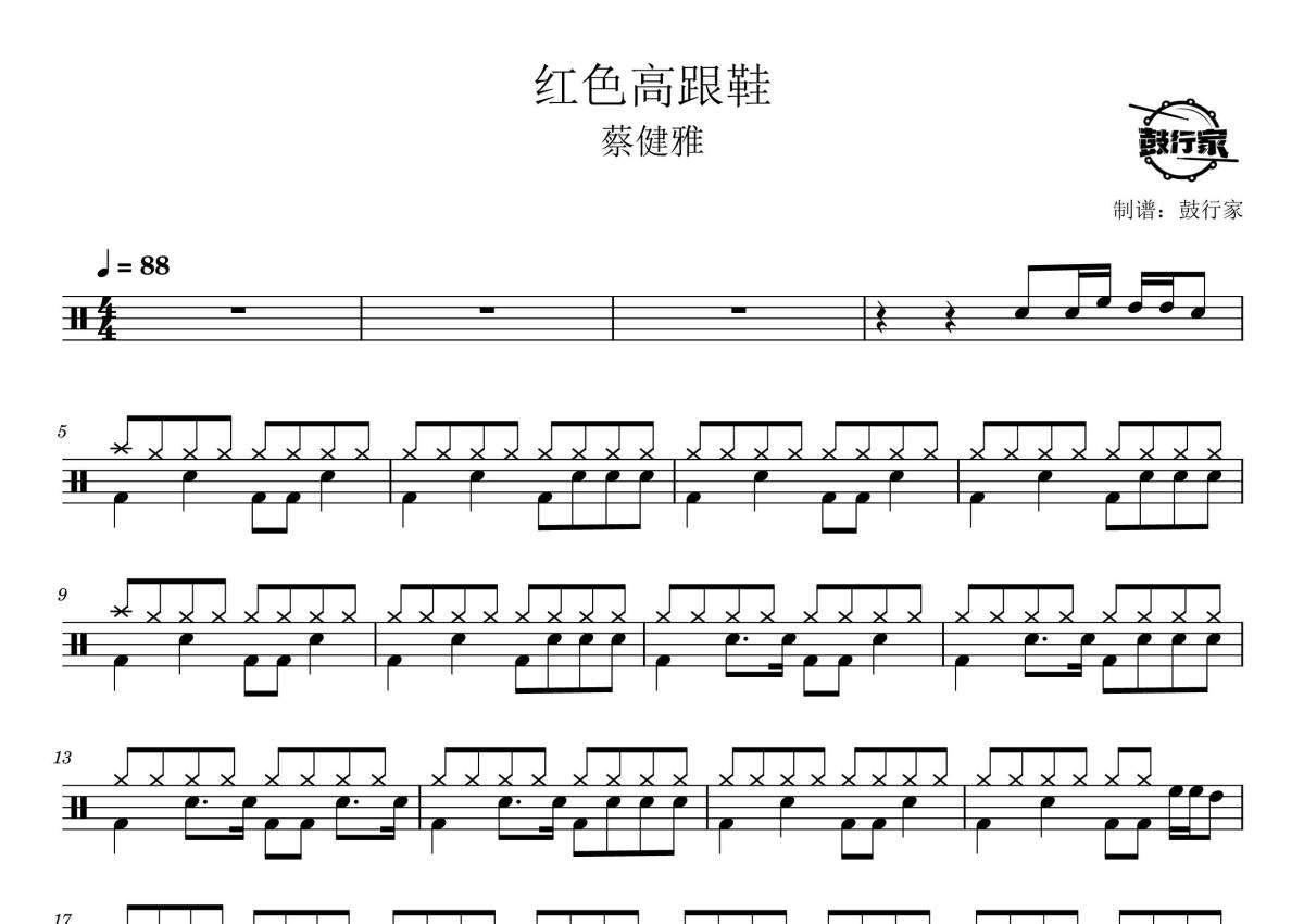 《红色高跟鞋》是蔡健雅演唱的一首歌曲,拍号为4/4拍,歌曲速度为每分钟88拍,这份鼓谱共有两张高清图谱,图谱由 @鼓行家 编配上传,图谱使用五线谱编配,使用这份红色高跟鞋架子鼓谱,你将能够轻松地敲打出这首蔡健雅的红色高跟鞋,快来尝试吧。